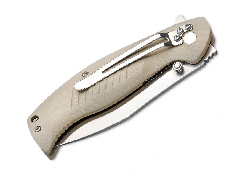 Rękojeść posiada okładziny z trwałego tworzywa G-10. Otwieranie ostrza ułatwia obustronny kołek. Przed niekontrolowanym zamknięciem noża chroni blokada liner lock. Rękojeść posiada stalowy klips ułatwiający przypięcie foldera do krawędzi kieszeni czy paska.