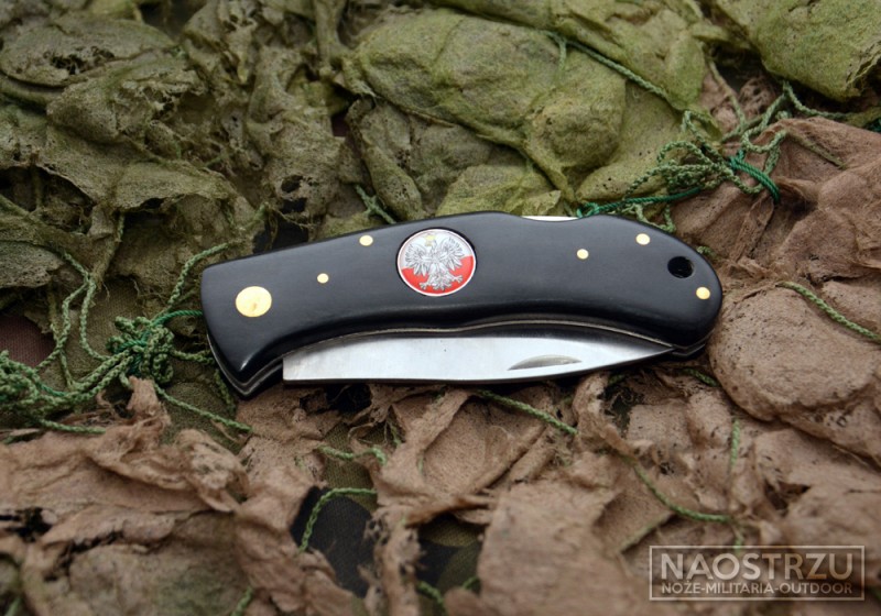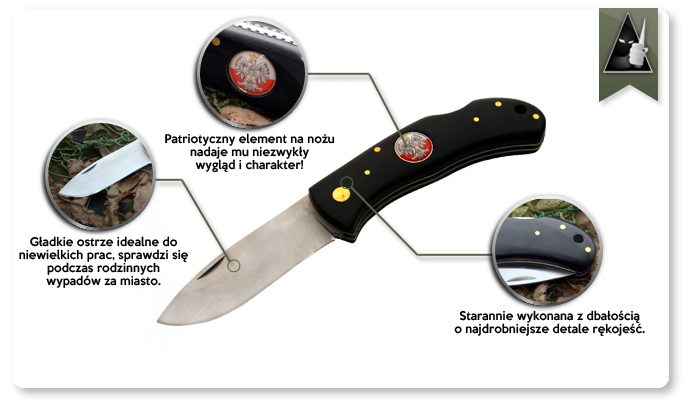 Znakomite narzędzie o niewielkich rozmiarach, które powinno znaleźć się w asortymencie każdego! Starannie wykonany nóż składany łączy w sobię dyskrecję i niezawodność. Niewątpliwym atutem produktu jest jego rozmiar po złożeniu, który wynosi zaledwie ok 10 cm, dzięki czemu nie zajmuje dużo miejsca i może być zawsze u naszego boku. Posiada bardzo starannie wykonaną, z dbałością o najdrobniejsze szczegóły rękojeść uzupełnioną Orłem na tle biało-czerwonej flagi. Niewątpliwie nóż jest gratką dla każdego pasjonata tego typu narzędzi uważającego się na patriotę!