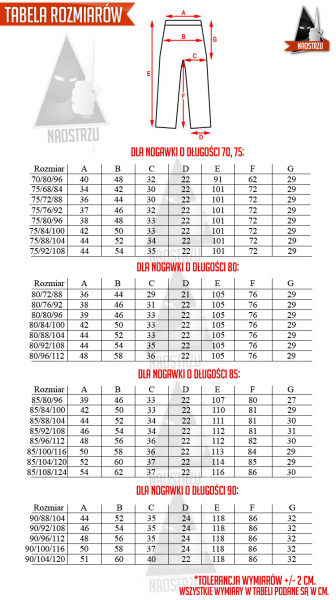 - Pierwsza wartość, to długość nogawki od kroku w centymetrach
