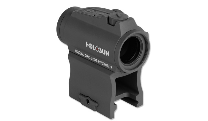 Seria Micro Red Dot marki Holosun składa się z niewielkich kolimatorów o niskiej wadze, dzięki czemu świetnie nadają się do uprawiania sportów strzeleckich. Model HS503GU posiada możliwość wyboru 2 punktów celowniczych, kropka 2 MOA z okręgiem 65 MOA oraz samej kropki 2 MOA. Kolimator ten ma w zestawie dwa montaże w komplecie: niski i wysoki 1/3 Co-Witness. Wersja z baterią umieszczaną z boku obudowy w zakręcanym przedziale.