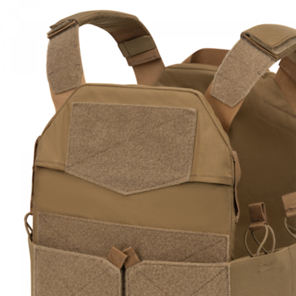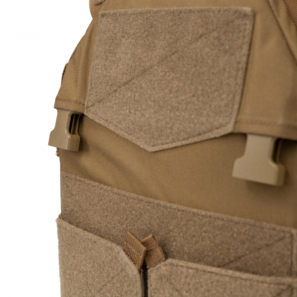 Elastyczne pasy boczne (cummerbund) posiadają wbudowane sekcje mieszczące magazynki AK/AR lub radio. Gdy są puste, pozostają płaskie, zachowując minimalistyczny profil. Duże panele velcro ułatwiają personalizację, a zintegrowany uchwyt transportowy zwiększa funkcjonalność w terenie.