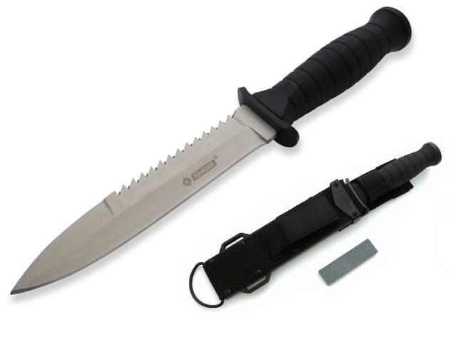 Dzięki chropowatej fakturze doskonale trzyma się ręki i pozwala na komfortową pracę nawet przez długi czas. Metalowy jelec skutecznie zabezpiecza dłoń przed zsunięciem się w stronę krawędzi tnącej. Dołączona wielofunkcyjna pochwa z cordury i tworzywa posiada uchwyty i szlufki, dzięki którym można ją przymocować do paska spodni albo przytroczyć do ramienia, uda czy łydki. W przedniej kieszonce kryje się ostrzałka, którą łatwo naostrzyć nóż w trudnych warunkach.