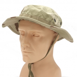 Wysokiej jakości kapelusz amerykańskiej firmy Teesar, Inc. Cartesville, Ga. Wzór wykorzystywany przez US Army podczas wojny w Wietnamie. Posiada szerokie rondo chroniące przed warunkami atmosferycznymi - słońcem i deszczem. Wyposażona jest w 4 metalowe wywietrzniki zapewniające doskonałą wentylację, które zapobiegają również dostaniu się insektów pod kapelusz. Wokół czapki poprowadzona jest taśma mocująca umożliwiająca podpięcie drobnego ekwipunku lub elementów maskujących. Przystosowana jest również do stosowania wraz z moskitierą. Dodatkowym atutem czapki jest linka zapobiegająca zsuwaniu się czapki z głowy, którą można również wykorzystać do upięcia ronda do góry.