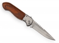 Idealny na każdą okazję nóż sprężynowy. Jego optymalne rozmiary pozwalają na schowanie go do kieszeni, plecaka czy w każde inne miejsce. Dodatkowo, by jako narzędzie mógł być zawsze pod ręką, do zestawu dołączony został czarny pokrowiec z cordury, który można przymocować do paska spodni. Błyskawiczny nóż sprężynowy posiada spiczastą głownię o profilu drop point, która została wykonana z wysokogatunkowej stali nierdzewnej typu 420. Materiał ten jest wyjątkowo wytrzymały i odporny na korozję. Zewnętrzna część rękojeści została obłożona drewnianymi okładzinami, które nadają całości naturalnego wyglądu. Nóż otwiera się bardzo płynnie i wręcz błyskawicznie. Sam proces otwarcia jest bardzo intuicyjny i rozpoczyna się za pomocą przycisku. Nożyk składany został wyposażony w blokadę typu plunge lock, która zabezpiecza przed niepożądanym otwarciem, a w pozycji otwartej przez niechcianym zamknięciem.