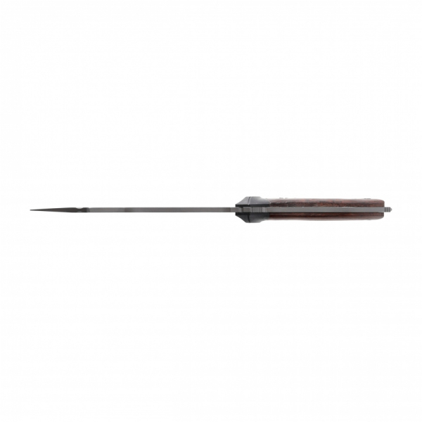 Rękojeść noża wykonano z 2 materiałów: odpornego laminatu G10 (obustronny jelec chroniący dłoń przez zsunięciem na ostrze) oraz drewna orzechowego, z którego powstały profilowane okładziny. W wystającym trzpieniu znajduję się otwór, który pozwala na wplecenie linki lub rzemienia.