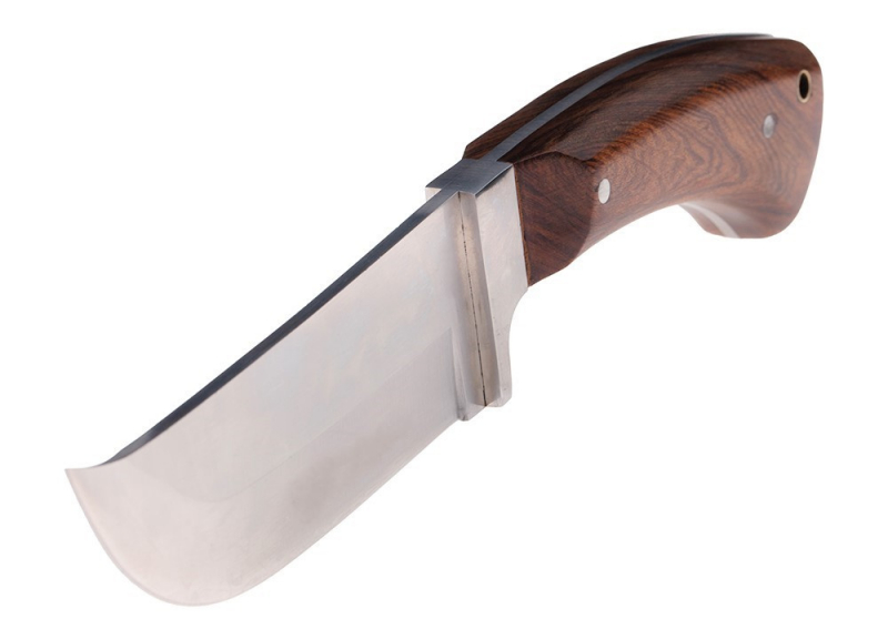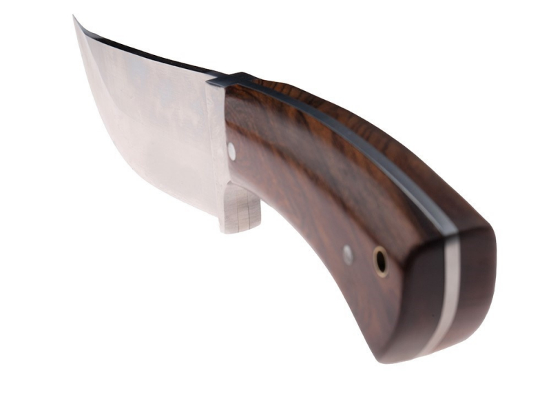 Profil trailing point – grzbiet głowni łagodnie wznosi się ku sztychowi, który znajduje się wyraźnie powyżej linii ostrza. To klasyczny profil noża skórującego: podniesiony sztych minimalizuje ryzyko przypadkowego przebicia wnętrzności przy oprawianiu zwierzyny lub patroszeniu ryb. Szeroki brzusiec ułatwia długie, płynne cięcia skóry.