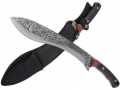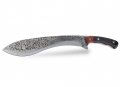 Piękna maczeta kukri w całości zdobiona rewelacyjnym ornamentem florystycznym. Mimo porywającego wyglądu nóż myśliwski jest jednym z cięższych, masywniejszych i solidniejszych w swojej kategorii. Wszystko za sprawą niezawodnej konstrukcji typu Full Tang, która gwarantuje najwyższą jakość i odporność. Maczeta kukri będzie idealnym kompanem wszelkich wypraw, biwaków, obozów, survivalu i innych prac plenerowych. Odnajdzie się znakomicie podczas cięcia, rąbania, karczowania, a nawet batonowania. Wewnętrzy monolit został wykonany z wysokogatunkowej stali nierdzewnej typu 440. Materiał ten wykazuje ogromną odporność oraz wysokie właściwości antykorozyjne. Głownia o falowanym ostrzu gładkim została bogato zdobiona, za pomocą estetycznego czernienia we florystyczny deseń. Ergonomiczna rękojeść świetnie leży w dłoni i pozwala na swobodną i komfortową pracę. Została wykonana z dwukolorowych, drewnianych okładzin. Cechą charakterystyczną maczety kukri jest przesunięcie środka ciężkości w stronę głowni, co usprawnia wykonywanie wymachów, przekładając siłę zamachu na siłę cięcia.
