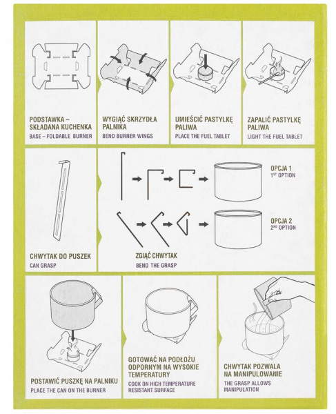Zestaw do gotowania i podgrzewania posiłków w warunkach outdoorowych. Dzięki małym wymiarom i wadze łatwy do zabrania na każdą wyprawę turystyczną lub survivalową . Konstrukcja zestawu umożliwia jego wielokrotne wykorzystanie.