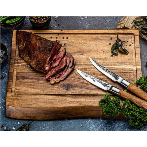 Piękna i stylowa deska do krojenia Style de Vie została wykonana w drewna akacjowego. Od spodu deska jest wyposażona w antypoślizgowe nóżki, dzieki czemu zapewnia stabilne cięcie i bezpieczeństwo nawet gdy na powierzchni blatu pojawi się woda. Deska posiadarównież boczne uchwyty w postaci podcieć, ułatwiające pochwycenie jej i podniesienie.