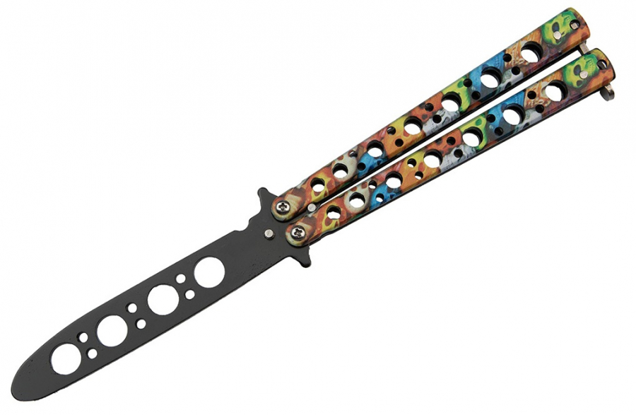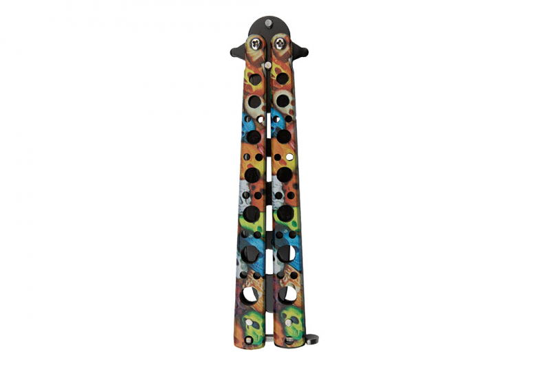 Tradycyjna dla motylków rękojeść została wykonana z dwóch ruchomych elementów, które w pozycji zamkniętej zabezpieczają ostrze treningowe.