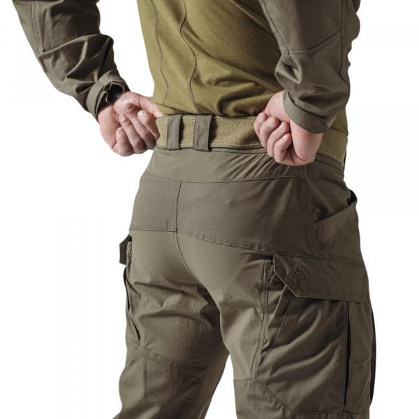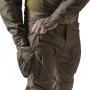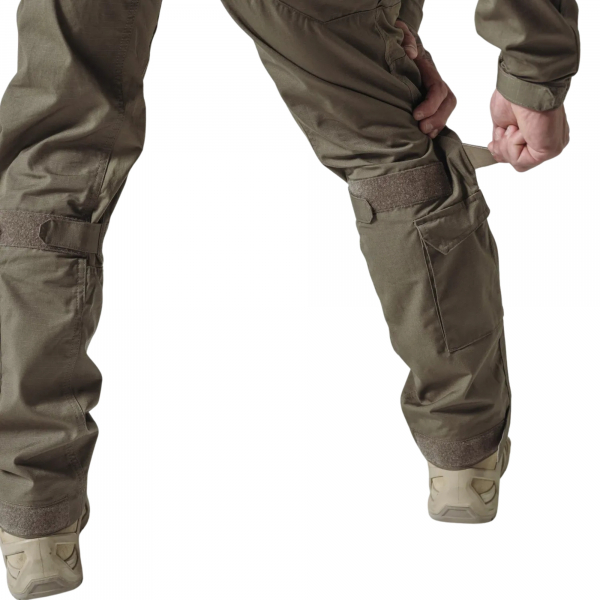 Spodnie wykonano z kontraktowej tkaniny NYCO Ripstop (50% nylon / 50% bawełna) o gramaturze 220 g/m², zapewniającej równowagę między odpornością na uszkodzenia a oddychalnością. Strefę kolan wzmocniono Cordurą® 500D, która pełni również funkcję kieszeni na opcjonalne wkładki ochronne.