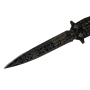 Cała powierzchnia noża – zarówno głownia, jak i rękojeść – została pokryta trwałą czarną powłoką, na której naniesiono laserowo precyzyjny wzór typu tribal/damascus. Kontrast między głęboką czernią a jasnymi detalami sprawia, że podczas wykonywania trików nóż tworzy niesamowity efekt wizualny, hipnotyzując widza każdym ruchem.