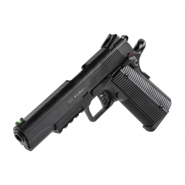 Pistolet wiatrówka Umarex BlaMer w kalibrze 4,5 mm BB nawiązuje swoim wyglądem do kultowego już pistoletu wojskowego Colt 1911, wykorzystywanego przez żołnierzy na wielu frontach. Wiatrówka przeznaczona do strzelania rekreacyjnego. Będzie dobrym wyborem dla osób rozpoczynających przygodę w strzelectwie. Lekka konstrukcja i zasilanie kapsułami CO2 sprawia, że pistolet Umarex może być wygodnie użytkowany przez każdego (młodsi, pod czujnym okiem osoby dorosłej). Pojemny magazynek oraz prędkość początkowa śrutu 105 m/s, zapewniają radość ze strzelania i skuteczne trafianie w cel.
