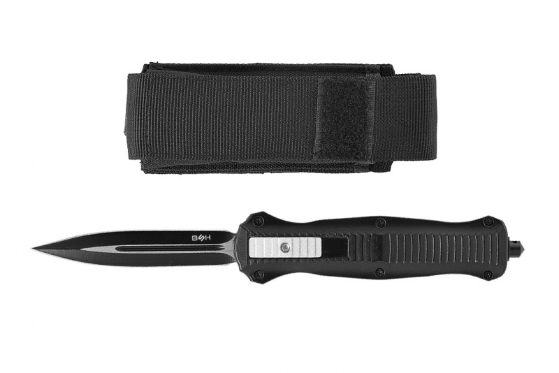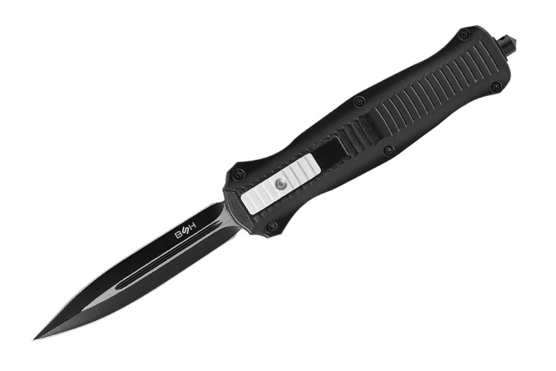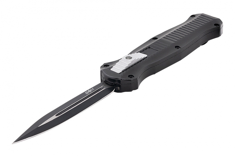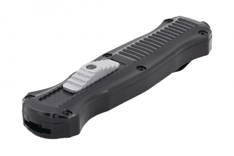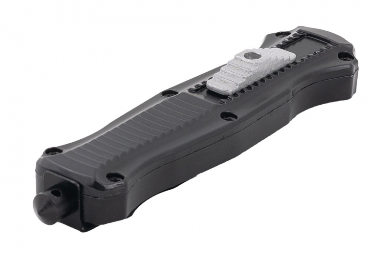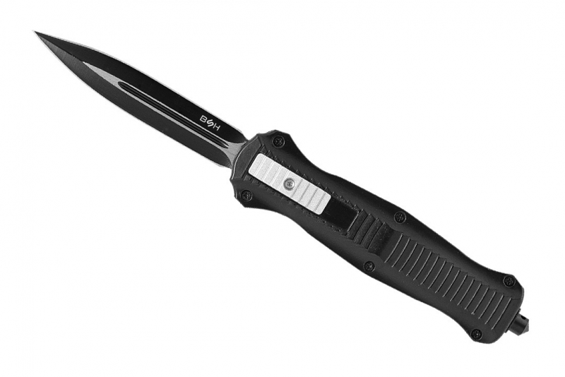 Nóż sprężynowy typu OTF (Out The Front), z ostrzem wysuwanym od frontu, który z pewnością spełni oczekiwania najbardziej wymagających użytkowników. Model OTF-2 charakteryzuje się ostrzem, które automatycznie wysuwa się i chowa w rękojeści, zapewniając wygodę i szybkość działania. Nóż posiada głownię typu dagger (sztylet) o podwójnym ostrzu, idealną do precyzyjnych cięć. Dodatkowo, stylowe czernienie nadaje mu oryginalny i nowoczesny wygląd. Wzdłuż rękojeści znajdują się wycięcia, które poprawiają pewność chwytu. Rękojeść jest elegancka i ergonomiczna, zapewniając pewny chwyt i komfort użytkowania. Duży klips umożliwia łatwe przypięcie noża do pasa czy kieszeni, a wybijak przydaje się w sytuacjach awaryjnych. Aby otworzyć nóż, wystarczy przesunąć suwak znajdujący się na rękojeści do góry. Zamknięcie ostrza następuje poprzez przesunięcie suwaka w dół. Mocny i precyzyjny mechanizm zapewnia niezawodność działania w każdej sytuacji.