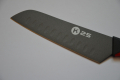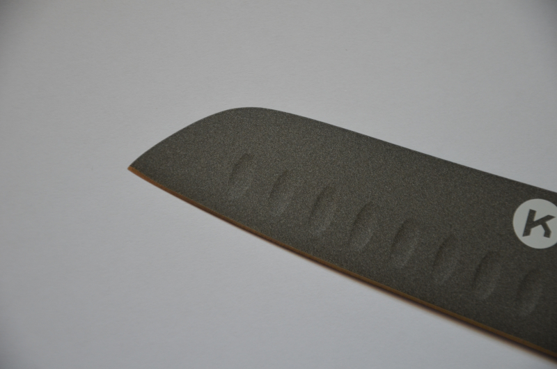 Głownia wykonana ze stali nierdzewnej została w całości pokryta szarą powłoką tytanową (Titanium Coated), która nie tylko nadaje jej agresywnego wyglądu, ale przede wszystkim chroni przed korozją i minimalizuje przywieranie krojonych produktów. Szeroka klinga i charakterystycznym dla Santoku profilu doskonale sprawdza się przy siekaniu warzyw, porcjowaniu mięsa oraz ziół.