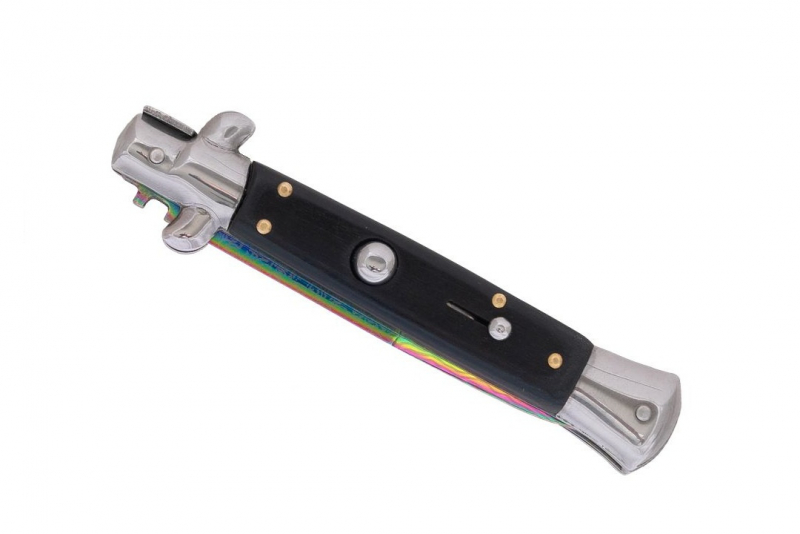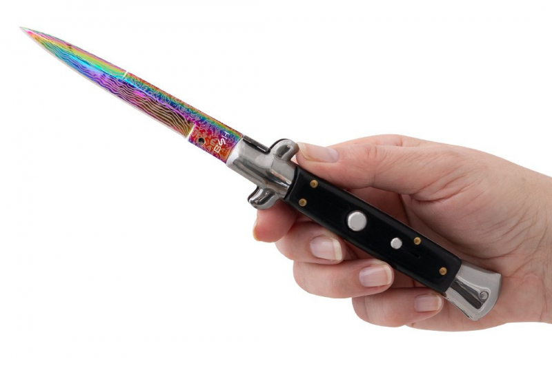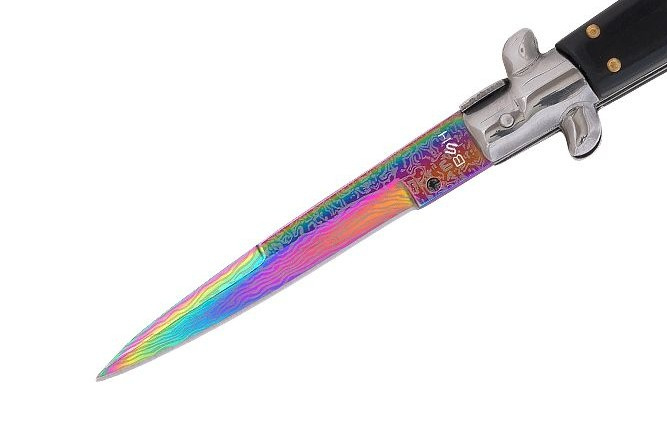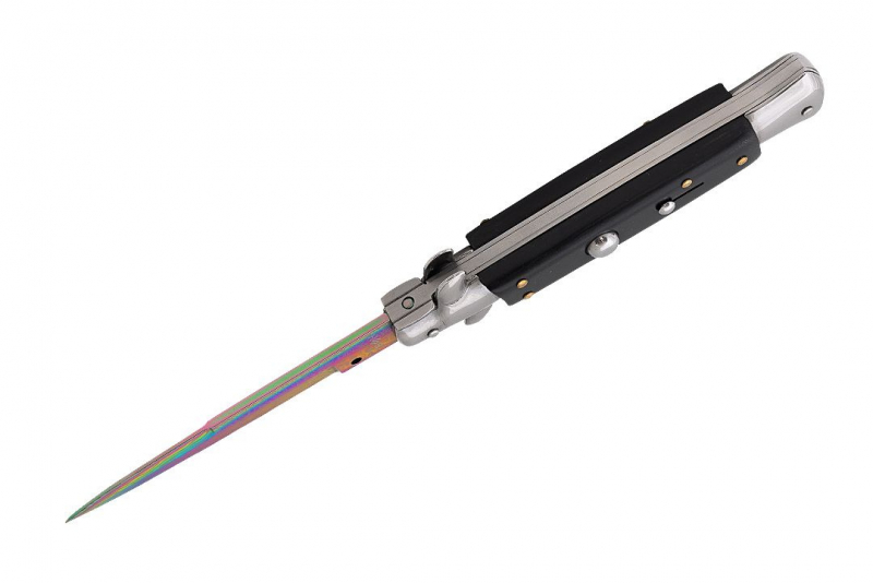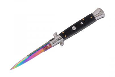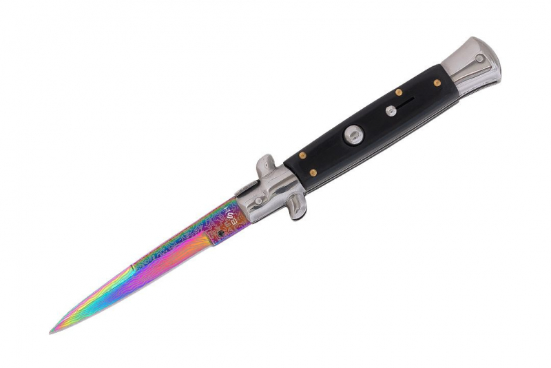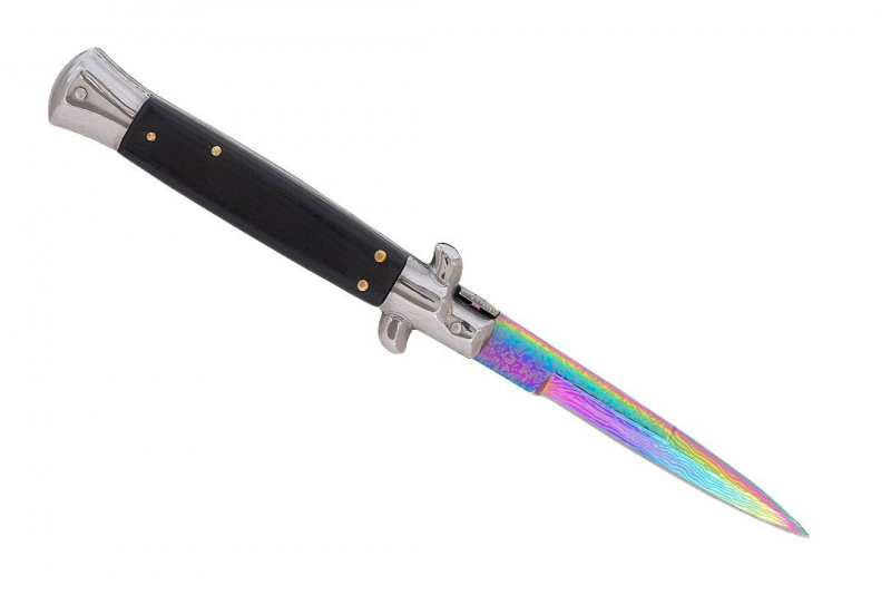 Błyskawiczny nóż sprężynowy wzorowany na klasycznych, włoskich sycylijkach. Rewelacyjny projekt i designerskia głownia w kolorze rainbow damast to gwarancja efektywności i niezwykłej sprawności. Sycylijka wygląda rewelacyjnie i niezwykle oryginalnie. Głownia o klasycznym profilu spear point została wykonana z wysokogatunkowej stali nierdzewnej typu 420. Materiał ten posiada wyjątkowo wysokie właściwości antykorozyjne i jest odporny na ścieranie. Smukła, wydłużona głownia jest doskonale wyprofilowana do zadawania pchnięć. Wykonana ze stali i drewnianych okładzin rękojeść jest bardzo wygodna, dobrze leży w dłoni i pozwala na pewny uchwyt. Włoski nóż sprężynowy posiada bolster pełniący funkcję jelca, można na nim bezpiecznie oprzeć kciuk oraz zapobiega on ześlizgnięciu się ręki w stronę ostrza. Uruchomienie mechanizmu sprężynowego następuje po wciśnięciu dużego przycisku znajdującego na rękojeści. Otwarcie noża sprężynowego jest bardzo łatwe i intuicyjne, a proces zachodzi wręcz błyskawicznie. Nóż sprężynowy posiada dwie blokady, pierwsza odpowiedzialna jest za blokowanie przycisku, tak by nóż nie otworzył się samoistnie. Druga blokada typu frame lock unieruchamia ostrze i nie pozwala na niechciane zamknięcie się noża, jest ona zwalniana za pomocą bolstera.