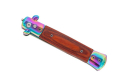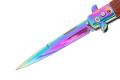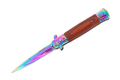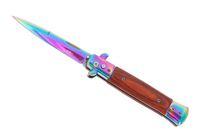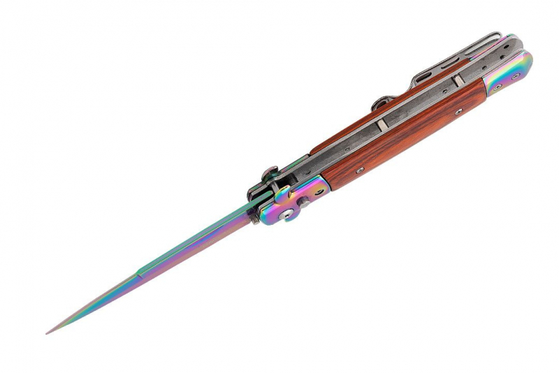 Nóż sprężynowy w kolorze rainbow fade wzorowany na kultowych, włoskich sycylijkach. Wygląda on rewelacyjnie i niezwykle oryginalnie, będzie doskonałym prezentem dla każdego fana noży. Głownia o klasycznym profilu spear point została wykonana z wysokojakościowej stali nierdzewnej typu 420 oraz pokryta mieniącą się warstwą ochronną. Materiał ten posiada wyjątkowo wysokie właściwości antykorozyjne. Smukła, wydłużona głownia jest doskonale wyprofilowana do zadawania pchnięć. Wykonana ze stali i drewnianych okładzin rękojeść jest bardzo wygodna, dobrze leży w dłoni i pozwala na pewny uchwyt. Włoski nóż sprężynowy posiada bolster pełniący funkcję jelca, który zabezpiecza dłoń przed zsunięciem się w stronę krawędzi tnącej. Uruchomienie mechanizmu sprężynowego następuje po wciśnięciu niewielkiego przycisku znajdującego się na rękojeści. Przycisk ten jest odpowiedzialny także, za zwolnienie blokady przy chowaniu ostrza. Sam moment wysunięcia jest błyskawiczny i wyjątkowo płynny. Nóż sprężynowy posiada dodatkową blokadę typu plunge, która zabezpiecza nóż przed niepożądanym otwarciem.