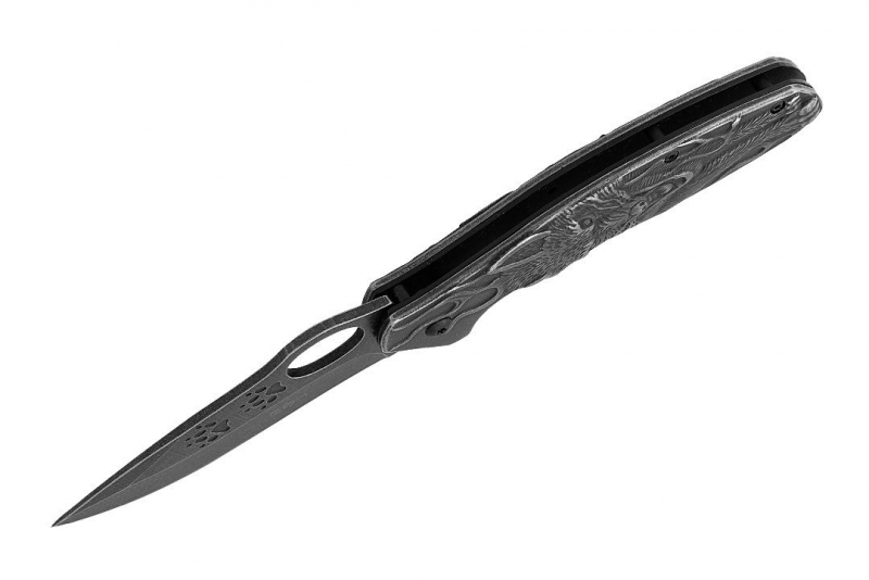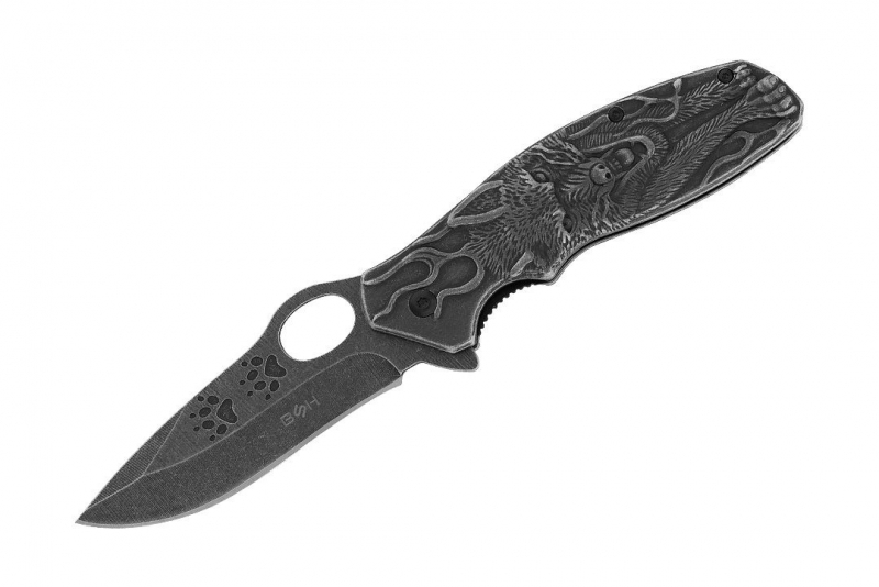 Potężny nóż składany ze spektakularnym wizerunkiem wilka. Rewelacyjnie się prezentuje, a kolor typu stonewash tylko dodaje oryginalności. Nóż posiada rzeźbiony i wypukły wizerunek wilka na rękojeści oraz grawerowane ślady na ostrzu. Ostra głownia o lekko falowanym profilu clip point została wykonana z wysokojakościowej stali nierdzewnej 440, która została pokryta wspomnianą warstwą ochronną w stonewash. Nóż składany otwiera się za pomocą wspomaganego sprężyną flippera oraz dzięki dużemu otworowi pod kciuk. W pozycji otwartej z łatwością można umieścić palec w otworze, co pomaga przy bardziej precyzyjnych pracach. Nóż WOLF posiada wbudowaną blokadę liner lock, która zabezpiecza ostrze przed samoistnym zamknięciem. Wygodna, ergonomiczna rękojeść została wykonana z rewelacyjnie rzeźbionej stali. Idealne gabaryty oraz zwinność noża pozwalają na łatwe i bezproblemowe schowanie go do kieszeni czy schowka samochodowego, a dzięki metalowemu klipsowi można go także przypiąć do paska spodni.