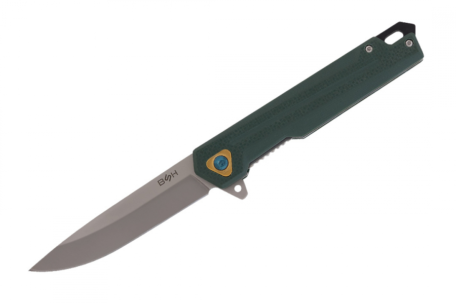Elegancki nóż sprężynowy od marki BSH ADVENTURE. Nóż N-072A w kolorze zielonym to doskonałe narzędzie EDC do codziennych czynności, będzie świetnie prezentował się w każdych okolicznościach. Głownia o smukłym profilu typu drop point została wykonana z wysokojakościowej stali nierdzewnej 420, pokrytej dodatkowo powłoką ochronną w kolorze szarym. Smukła, wygodna rękojeść doskonale leży w dłoni i zapewnia mocny, pewny uchwyt. Jest wykonana z ergonomicznego tworzywa w zielonym kolorze i ozdobiona złotym nitem. Nóż sprężynowy otwiera się za pomocą wspomaganego flippera, który zapewnia łatwe i bezproblemowe otwarcie noża. Proces otwarcia przebiega błyskawicznie i niezwykle płynnie. Nóż posiada blokadę liner lock, która skutecznie zabezpiecza ostrze przed niepożądanym zamknięciem. Dodatkowo nożyk BSH ADVENTURE posiada metalowy klips, który umożliwia przyczepienie do paska spodni.