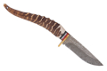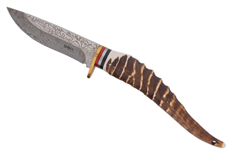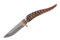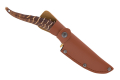 Przepiękny nóż myśliwski imitujący stal damasceńską oraz poroże jelenia prezentuje się wyjątkowo efektownie. Ta kompaktowa finka będzie znakomitym uzupełnieniem ekwipunku każdego myśliwego, wędkarza czy harcerza. Ostrze w profilu drop point wykonano z wysokiej jakości stali nierdzewnej 440, która cechuje się bardzo dobrą odpornością na korozję. Dodatkowa powłoka imitująca damast zwiększa wytrzymałość głowni oraz chroni ją przed zarysowaniami i innymi uszkodzeniami. Komfortowa rękojeść została pokryta okładzinami z tworzywa wiernie odwzorowującego strukturę jeleniego rogu. Jej chropowata faktura oraz oryginalny, wydłużony kształt zapewniają pewny uchwyt i zapobiegają ślizganiu się dłoni. Nóż wyposażono w niewielki jelec, który mimo skromnych rozmiarów skutecznie chroni dłoń przed ześlizgnięciem się na ostrze. W komplecie znajduje się dopasowany pokrowiec z ekologicznej skóry, przystosowany do przypięcia przy pasku. Brązowy pokrowiec posiada zatrzask typu nap, który zabezpiecza nóż przed przypadkowym wypadnięciem. Nóż myśliwski BSH Adventure to świetny wybór na każdą wyprawę.