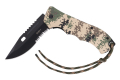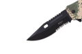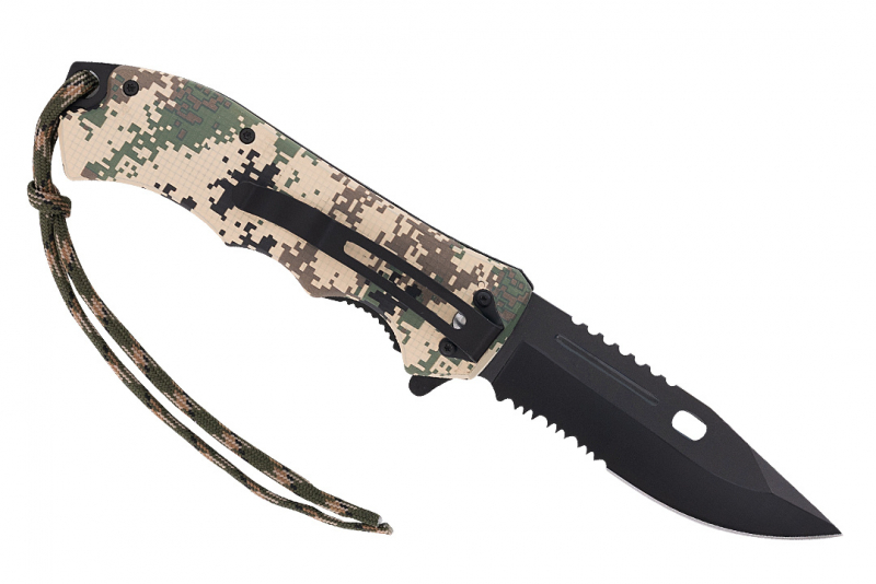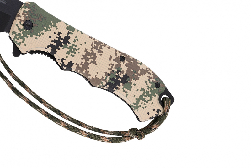 Składany nóż o militarnym charakterze będzie znakomitym uzupełnieniem Twojego ekwipunku. To świetny przykład noża EDC (every day carry), który sprawdzi się w najróżniejszych sytuacjach. Ostrze w profilu clip point powstało z wysokiej jakości stali nierdzewnej typu 440, znanej z dużej odporności na uszkodzenia oraz doskonałych właściwości antykorozyjnych. Ostrze posiada ząbkowanie służące niczym piła, a na grzbiecie umieszczono karbowanie przydatne zarówno przy używaniu krzesiwa, jak i jako podparcie dla kciuka podczas prac wymagających większego nacisku. Ergonomiczna rękojeść została wykonana z lekkich okładzin z laminatu G10. Nóż bardzo dobrze układa się w dłoni, gwarantując pewny i stabilny chwyt. Zarówno rękojeść, jak i linka utrzymane są w kolorystyce kamuflażu wojskowego. Otwieranie noża jest szybkie i komfortowe dzięki wspomaganemu flipperowi. Blokada typu liner lock skutecznie chroni ostrze przed przypadkowym złożeniem. Składany nóż N-077B BSH ADVENTURE to praktyczne narzędzie idealne na wyprawy, biwaki oraz aktywności survivalowe.