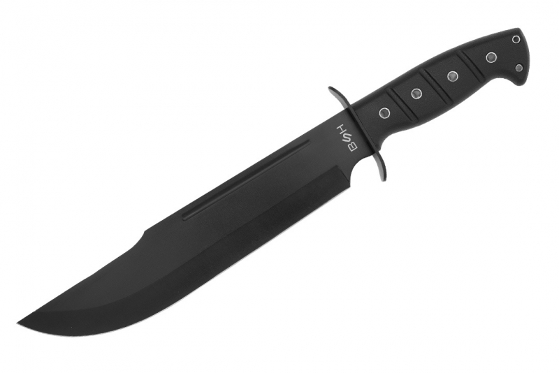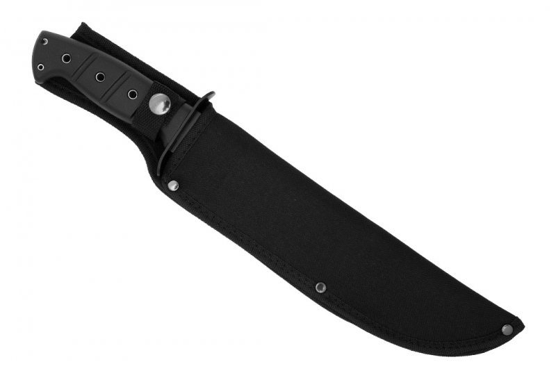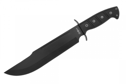 Imponujący nóż idealny do zadań taktycznych oraz survivalowych. Wyjątkowo długa głownia o profilu bowie została wykonana ze stali nierdzewnej typu 420. Materiał został dodatkowo pokryty czarną powłoką ochronną, która skutecznie niweluje efekt odblasku oraz chroni nóż przed korozją. Nóż taktyczny posiada świetnie wyprofilowane ostrze gładkie. Jest idealny do pracy w plenerowych warunkach, świetnie sprawdzi się podczas budowy obozu, w kuchni polowej czy nawet podczas oprawiania zwierzyny. Nóż został wyposażony w ergonomicznie wyprofilowaną rękojeść z gumopodobnego tworzywa. Materiał ten świetnie trzyma się dłoni, a dzięki właściwościom antypoślizgowym sprawdzi się doskonale podczas pracy w złych warunkach atmosferycznych. Nóż posiada jelec, który skutecznie chroni rękę przed zsunięciem się w stronę krawędzi tnącej.