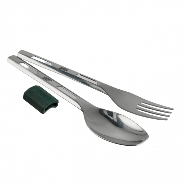 W komplecie znajdują się praktyczne sztućce turystyczne: