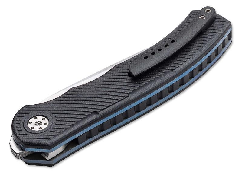 Anodyzowany na niebiesko tytanowy szkielet skrywający blokadę liner-lock, okrywają trójwymiarowo formowane okładki z G10. Klips to również wyfrezowany jednolity kawałek tego tworzywa. Głownia z japońskiej VG-10 jest elegancka, jednakże posiada kilka ciekawych elementów. Łagodna, klasyczna linia została złamana wysokimi szlifami płazów i długim fałszywym ostrzem, które nadają jej nieco „pazura”. Na grzbiecie wygospodarowano niewielką rampę pod kciuk.