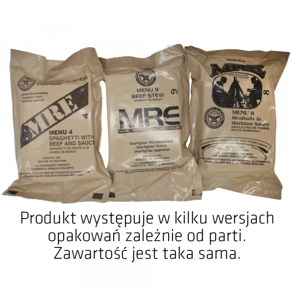Oryginalna racja żywnościowa US Army MRE (Meal, Ready-to-Eat) przeznaczona dla jednej osoby. Całość zamknięta została w szczelnym opakowaniu dzięki czemu posiada długi okres przydatności do spożycia. Dodatkowo każdy z produktów wewnątrz posiada osobne opakowanie. Przyrządzanie racji odbywa się za pomocą bezpłomieniowego podgrzewacza chemicznego, dzięki czemu możemy zjeść ciepły posiłek bez konieczności rozpalania ogniska. Każde Menu posiada inne danie główne.