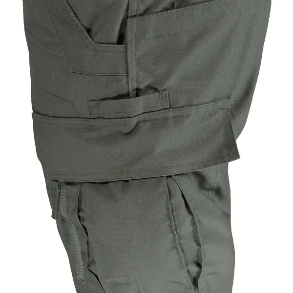 Materiał Ripstop (65% poliester, 35% bawełna) został wzmocniony w splocie, dzięki czemu spodnie są odporne na przetarcia i rozdarcia, a jednocześnie pozostają oddychające i szybkoschnące. W newralgicznych miejscach – na kolanach i pośladkach – zastosowano dodatkową warstwę tkaniny, co znacząco podnosi trwałość spodni podczas klękania, czołgania czy pracy w trudnym terenie.