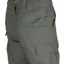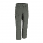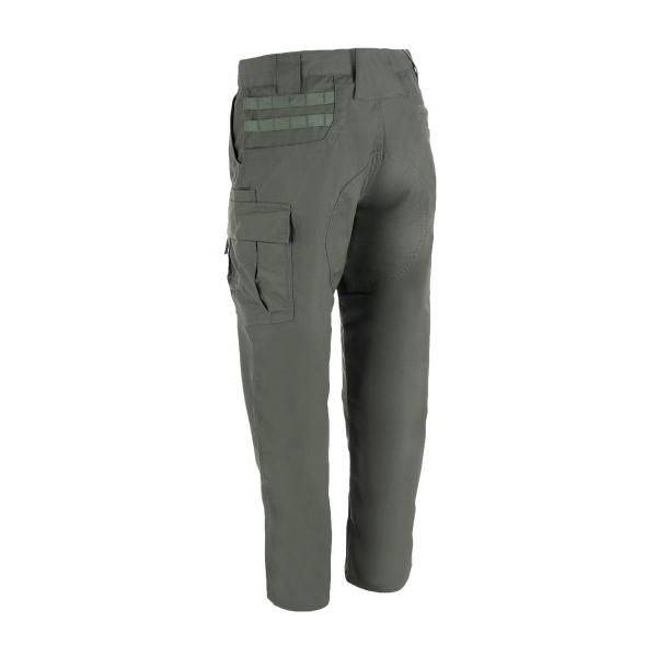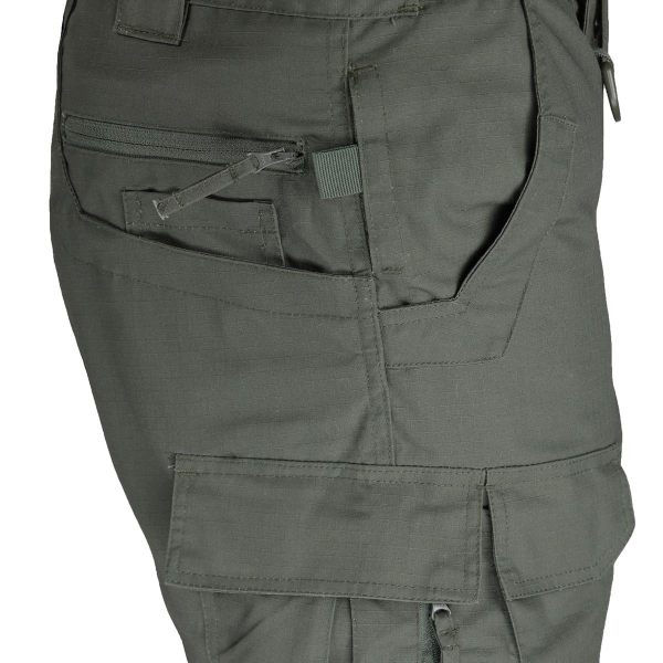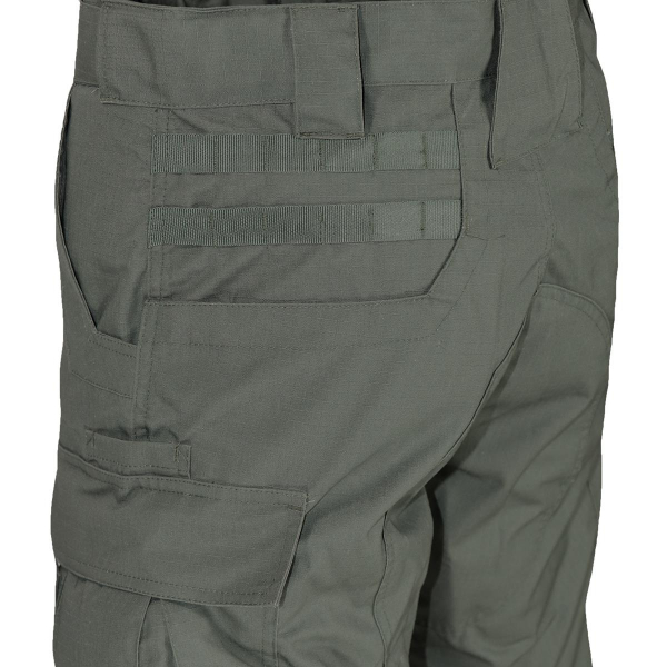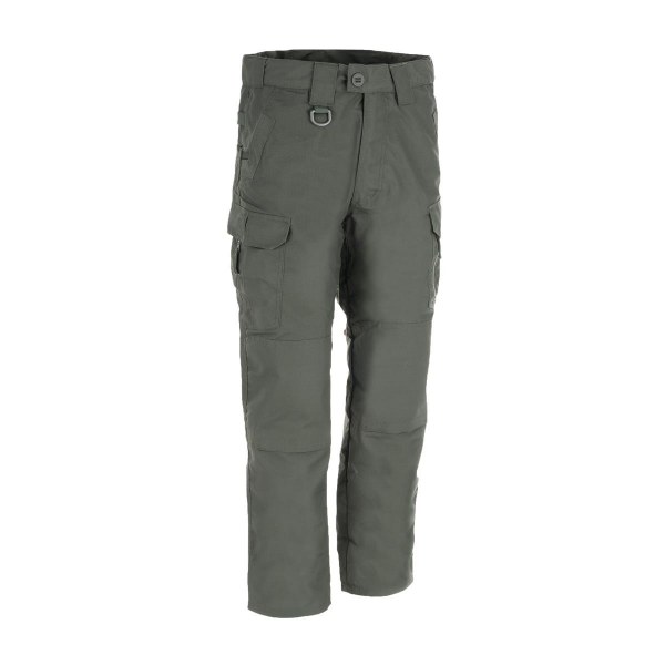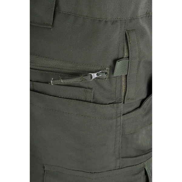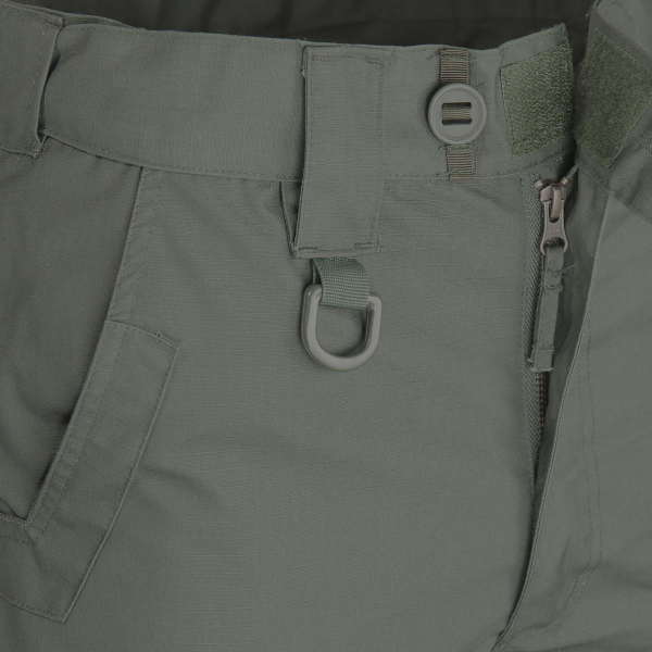 Krój spodni jest dopasowany, ale wygodny. W pasie wszyto gumy regulacyjne, które automatycznie dostosowują obwód do ruchu i warstw odzieży, a szerokie szlufki współpracują z pasami taktycznymi. Spodnie zapinane są na rzep, guzik kanadyjski i zamek błyskawiczny YKK, co daje pewne i trwałe zapięcie. D-Ring z przodu pozwala doczepić smycz, klucze lub karabińczyk.