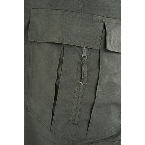 Rozbudowany system kieszeni: 2 górne, mała kieszonka na rzep przy prawej, 2 kieszenie cargo na rzep, płaska kieszeń na zamek, długa kieszeń przy lewej cargo, 2 kieszenie na kolanach, 2 kieszenie z tyłu, mała tylna kieszonka oraz tylna kieszeń na suwak. -