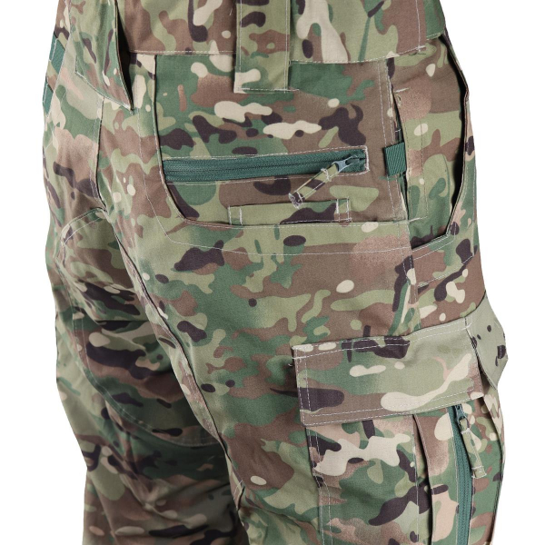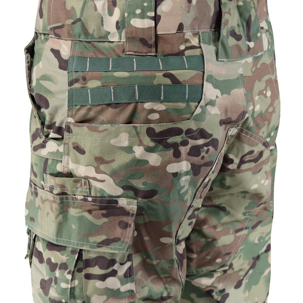 Materiał Ripstop (65% poliester, 35% bawełna) został wzmocniony w splocie, dzięki czemu spodnie są odporne na przetarcia i rozdarcia, a jednocześnie pozostają oddychające i szybkoschnące. W newralgicznych miejscach – na kolanach i pośladkach – zastosowano dodatkową warstwę tkaniny, co znacząco podnosi trwałość spodni podczas klękania, czołgania czy pracy w trudnym terenie.