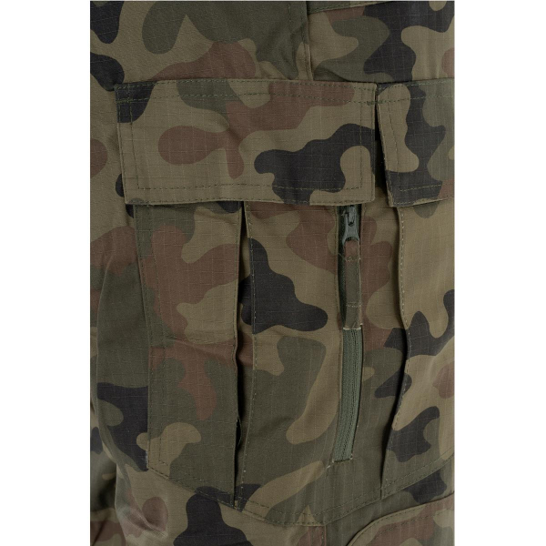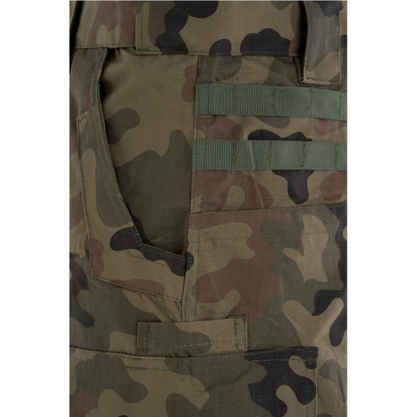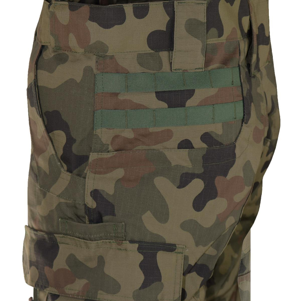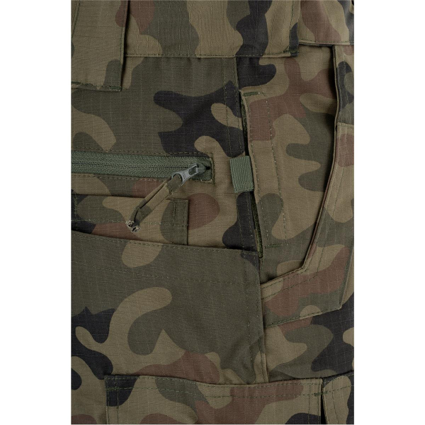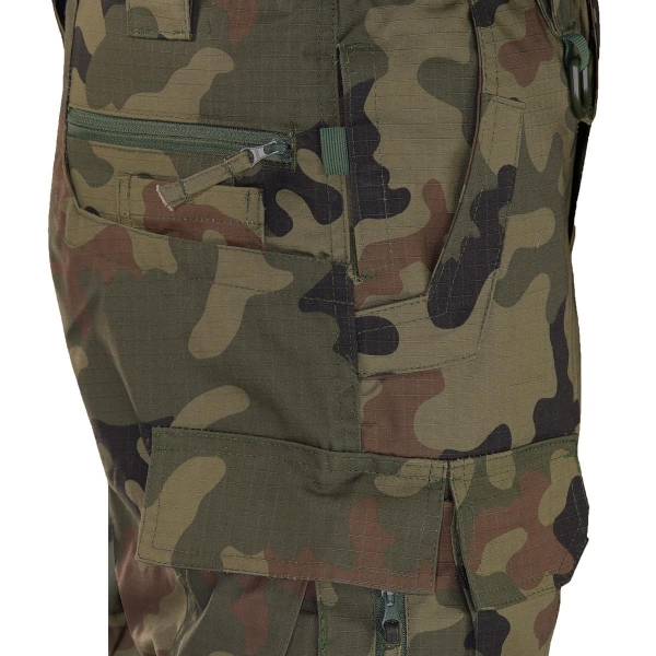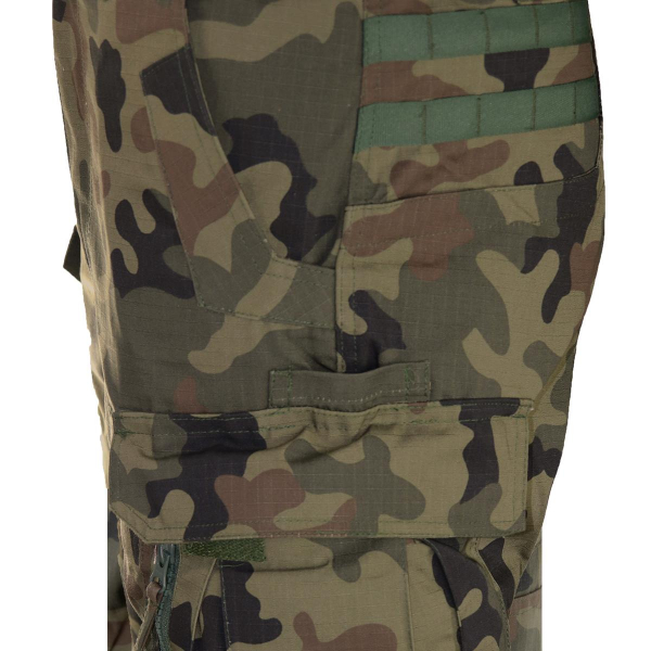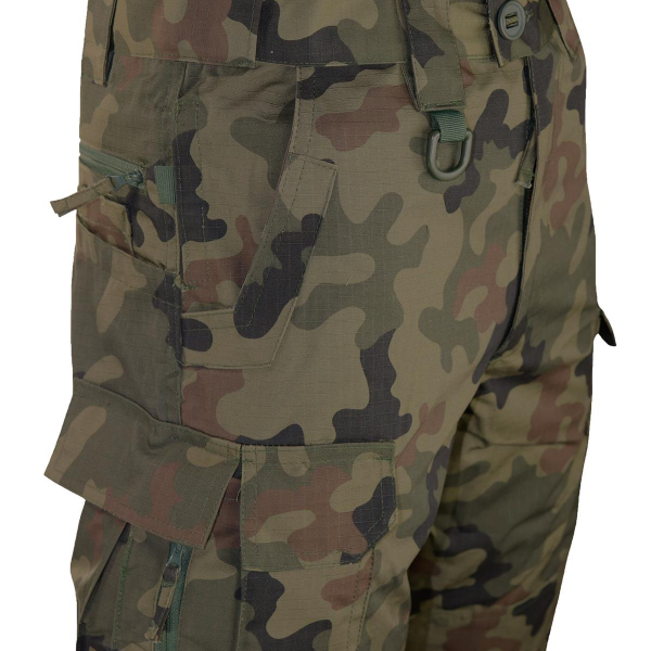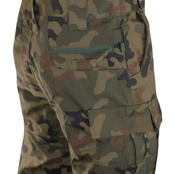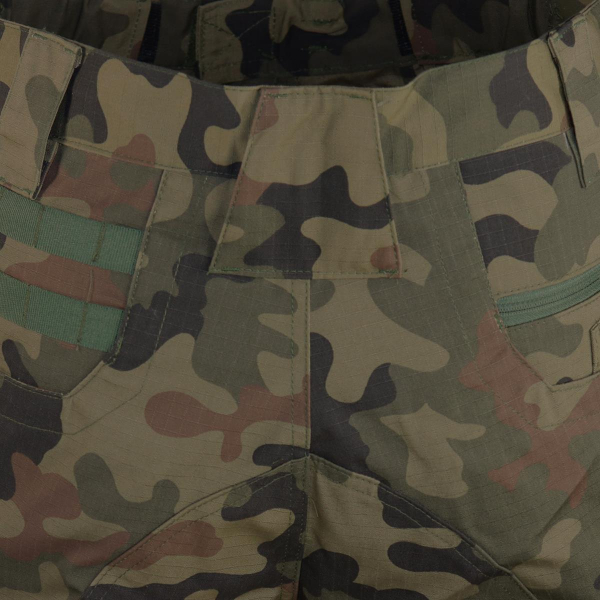 Materiał Ripstop (65% poliester, 35% bawełna) został wzmocniony w splocie, dzięki czemu spodnie są odporne na przetarcia i rozdarcia, a jednocześnie pozostają oddychające i szybkoschnące. W newralgicznych miejscach – na kolanach i pośladkach – zastosowano dodatkową warstwę tkaniny, co znacząco podnosi trwałość spodni podczas klękania, czołgania czy pracy w trudnym terenie.