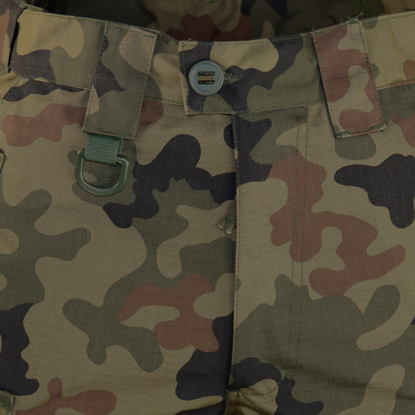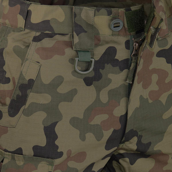 Krój spodni jest dopasowany, ale wygodny. W pasie wszyto gumy regulacyjne, które automatycznie dostosowują obwód do ruchu i warstw odzieży, a szerokie szlufki współpracują z pasami taktycznymi. Spodnie zapinane są na rzep, guzik kanadyjski i zamek błyskawiczny YKK, co daje pewne i trwałe zapięcie. D-Ring z przodu pozwala doczepić smycz, klucze lub karabińczyk.