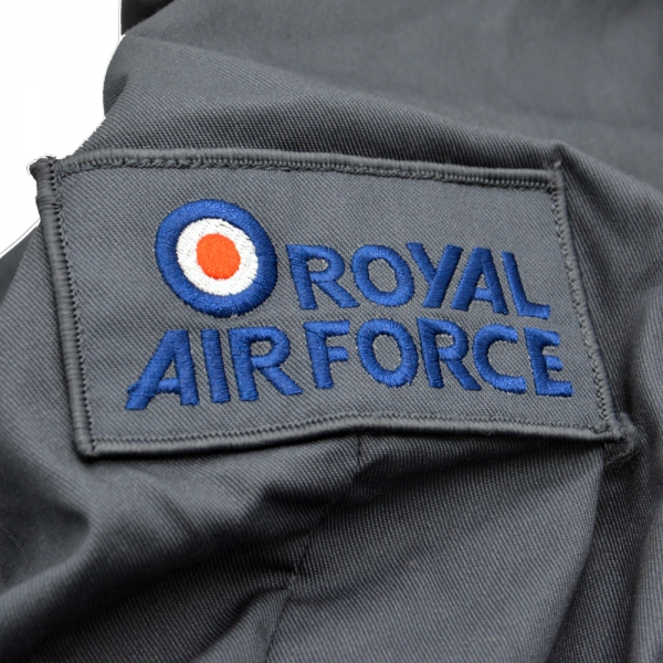 Kombinezon jednoczęściowy Royal Air Force w kolorze szarym z niebieskimi elementami zapinany jest od frontu na solidny rzep.